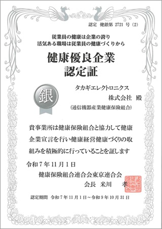 令和5年10月3日に健康保険組合連合会東京連合会様より「健康優良企業 銀」の認定を取得し、全社で健康経営健康づくりを継続した結果、昨年に引き続き今年も「銀」の認定を更新することができました。